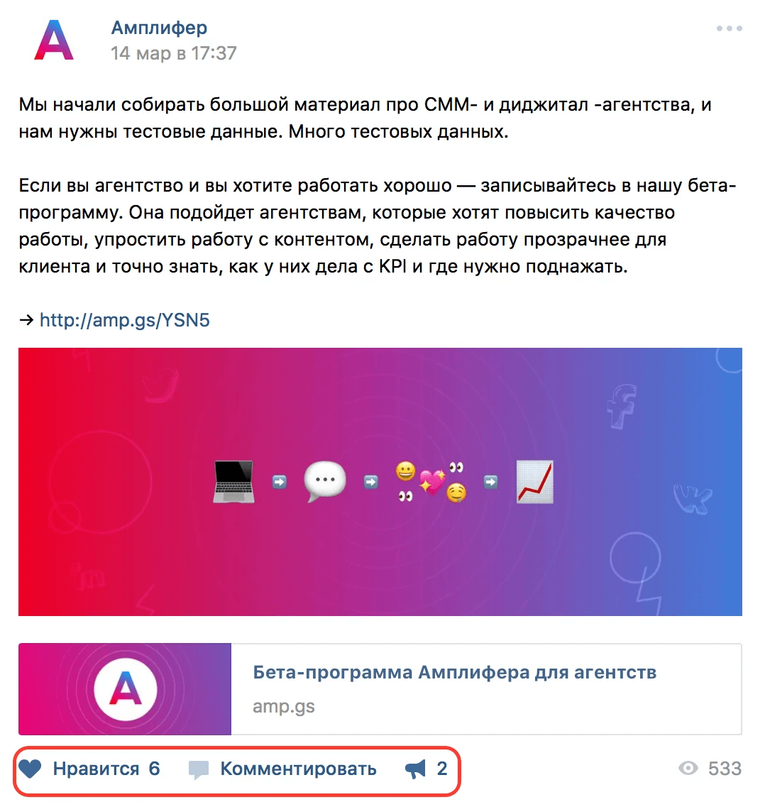 - Лайки — количество лайков, которые оставили подписчики и друзья к вашей публикации. Лайки присутствуют во всех соцсетях, включая Facebook, Instagram и ВКонтакте. Во ВКонтакте кнопка называется «Мне нравится». В Facebookе, кроме лайков, есть также «Реакции».