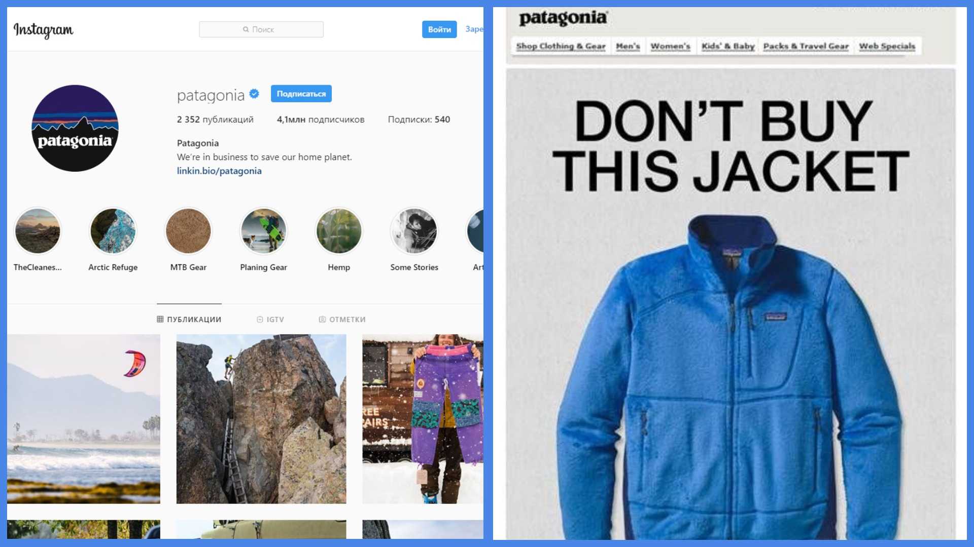 Так, например, Patagonia постоянно публикует в Instagram и Facebook призывы дважды подумать, прежде чем покупать новую одежду у себя же. Бренд предлагает бесплатно починить старые вещи в своих магазинах и учит своих пользователей в соцсетях самостоятельно подшивать и облагораживать старую и изношенную одежду. Покупатели настолько лояльны к Patagonia, что покупают их товары, чтобы выразить свою принадлежность к идеям защиты окружающего мира.