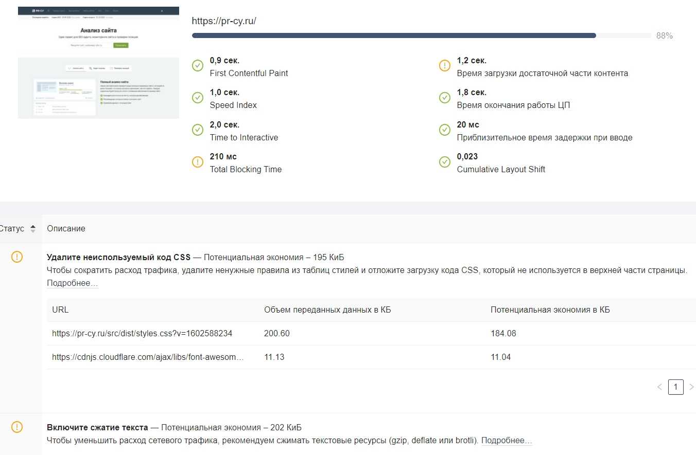 Фрагмент анализа скорости сайта