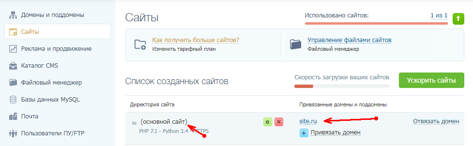 На скриншоте видно. что наша папка называется «Основной сайт», а домен, который привязан к этот папке называется site.ru. Здесь вы должны убедиться в том, что к папке привязан только один домен (тот, который вы зарегистрировали), а тестовый домен необходимо отвязать от этой папки, что бы в дальнейшем не было проблем.