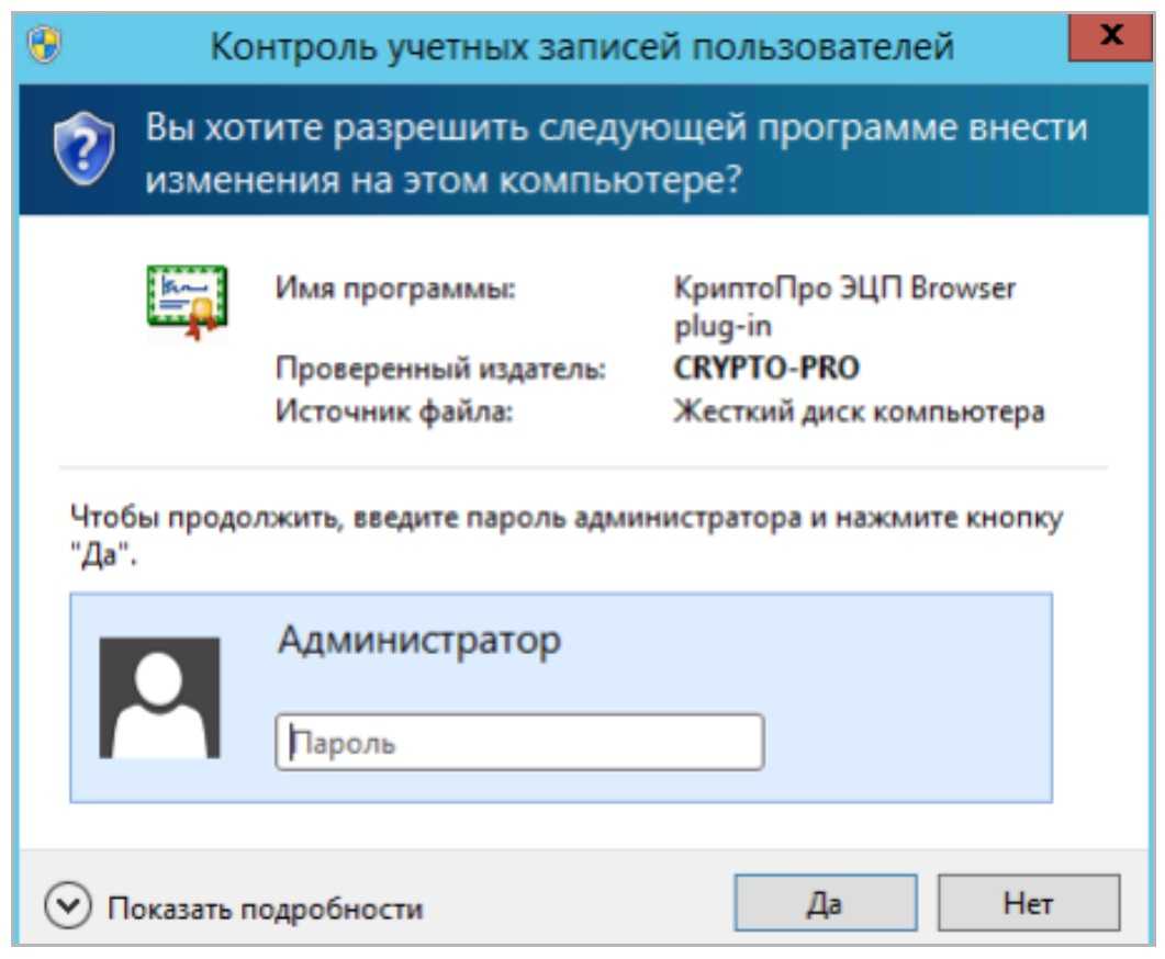 Перед настройкой плагина криптоПро для Интернет Эксплорер нужно установить его на ПК. Запустить инсталляцию файла, скачанного с сайта производителя (ссылка в предыдущем разделе). Установка софта (рассмотрим на примере Windows) возможна с доступом администратора, так как понадобится разрешение на внесение изменений: