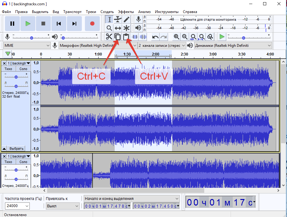 - копируем весь трек или выбранные фрагменты и вставляем их в другую композицию, пользуясь инструментами «Копировать» (Ctrl+C) и «Вставить» (Ctrl+V).