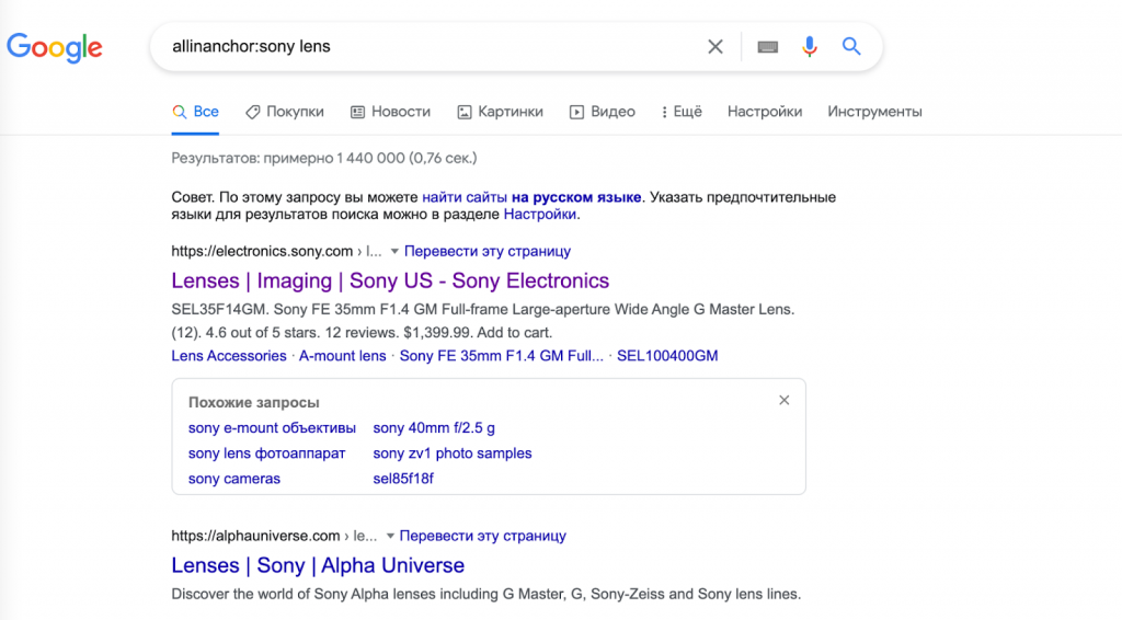 Пример использования: allinanchor:sony lens