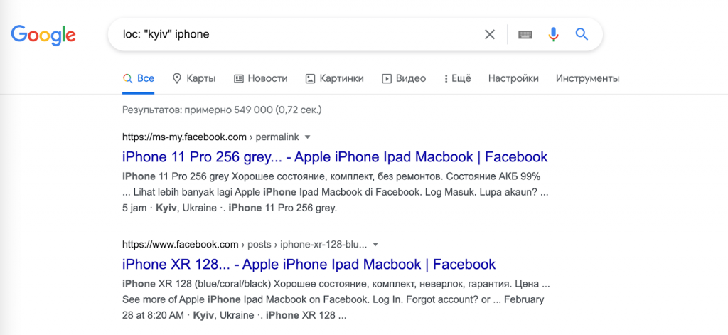 Пример использования: loc:”kyiv” iphone