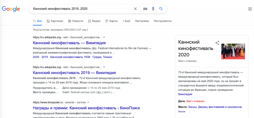 работает с диапазоном чисел. В нашем примере мы видим результаты по запросу «Каннский кинофестиваль за 2019 и 2020 годы».