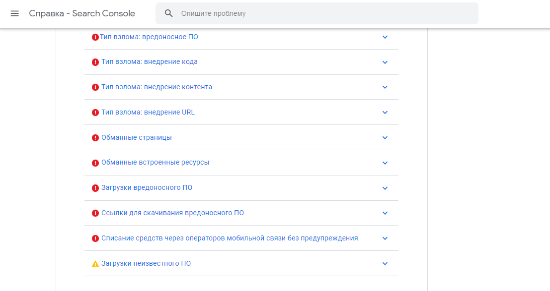 Здесь можно отслеживать действие вредоносного ПО, удалять его или отправлять на автоматическое изучение системой. К основным проблемам безопасности, которые удается контролировать Google Search Console, можно отнести:
