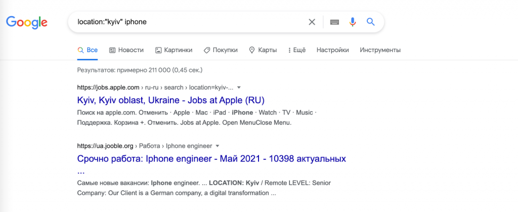 Пример использования: location:”kyiv” iphone