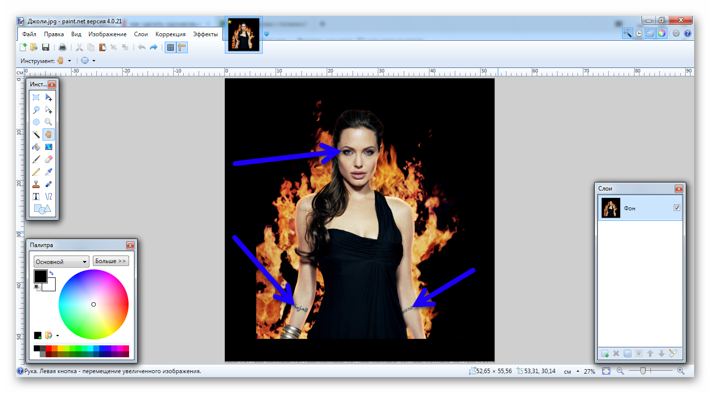 Задача: Акцентировать внимание красными стрелками без заливки у голливудской дивы в трёх местах: глаза и татуировки на обеих руках