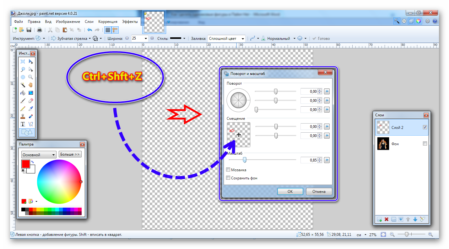 - Опция «Поворот и Масштаб…» / «Ctrl+Shift+Z».