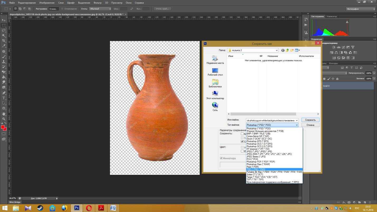 Теперь надо картинку сохранить. Как это сделать, я писал уже много раз. Кто забыл, можно прочитать в статье – ПОДПИСЫВАЕМ ФОТО ДЛЯ САМЫХ-САМЫХ . Единственное, что нужно будет сделать при сохранении, это поменять формат картинки. Не прозрачные картинки, как правило, в формате JPEG , а нам надо прозрачный, например PNG , это универсальный. Возьмите за правило на все свои работы ставить этот формат – не ошибетесь.