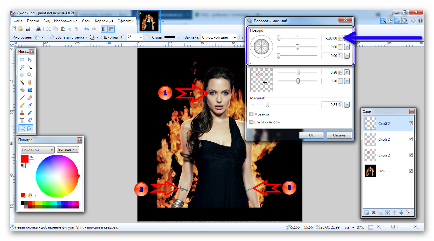А вот для разворота третьей необходимо задействовать один из параметров в функциональности «Поворот».