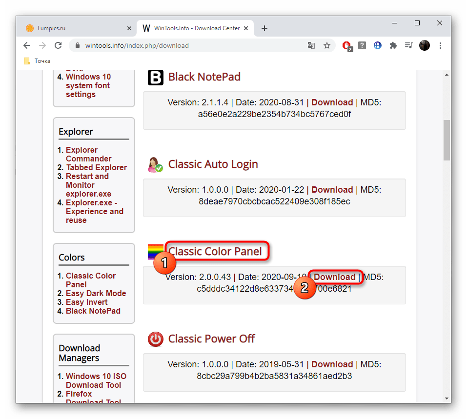 Еще один способ изменения цвета фона окна (и других цветов) — сторонняя утилита Classic Color Panel, доступная для загрузки на сайте разработчика WinTools.info