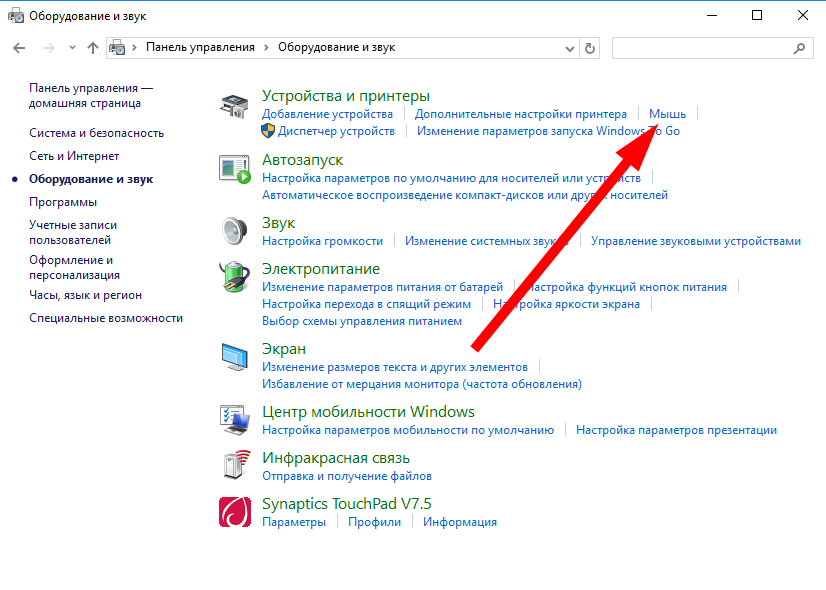 Откроется новое окно. Настраивать чувствительности мыши будем через раздел «Мышь».
