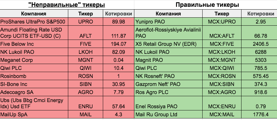 Как пример, акции компании ЮНИПРО. Тикер на Мосбирже — UPRO. Но если попробовать использовать его в таблицах, GoogleFinance будет выдергивать котировки иностранного биржевого фонда ProShares UltraPro S&P500, имеющего аналогичный тикер. Да еще и с долларовыми ценами.
