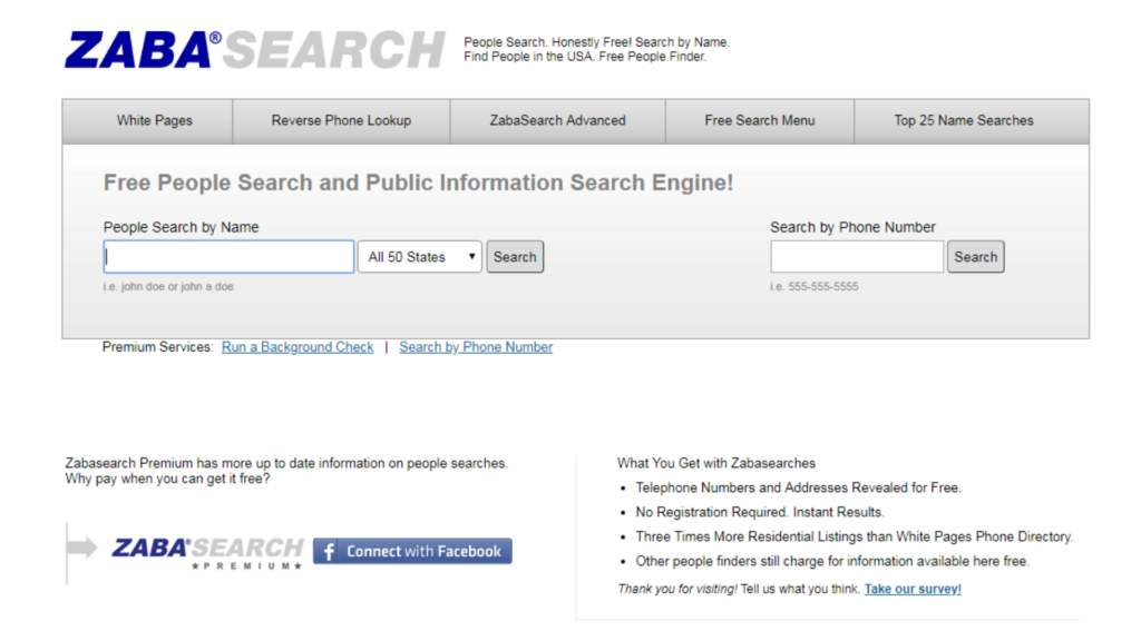 ZabaSearch предоставляет общедоступные данные о людях и о том, как они связаны с другими. Такими данными могут быть номер телефона, физический адрес и дата рождения, а также любая личная информация, доступная в Интернете.
