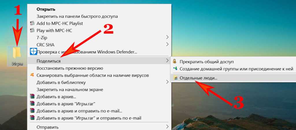 Выбираем папку которую хотим расшарить. Клацаем на ней ПКМ, выбираем «Поделиться», «Отдельные люди».