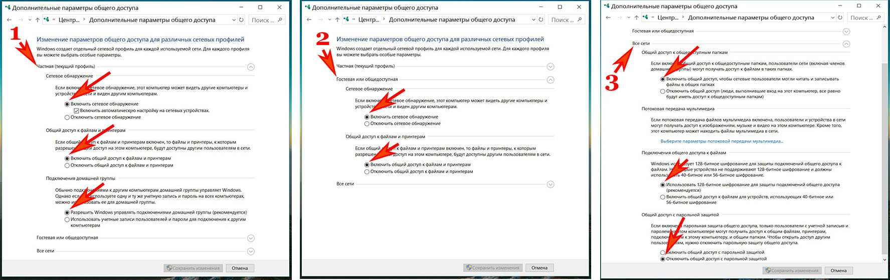 Выполняются общие настройки для сетевого профиля. На локальном компьютере в пункте «Изменение параметров сетевого доступа» включают: