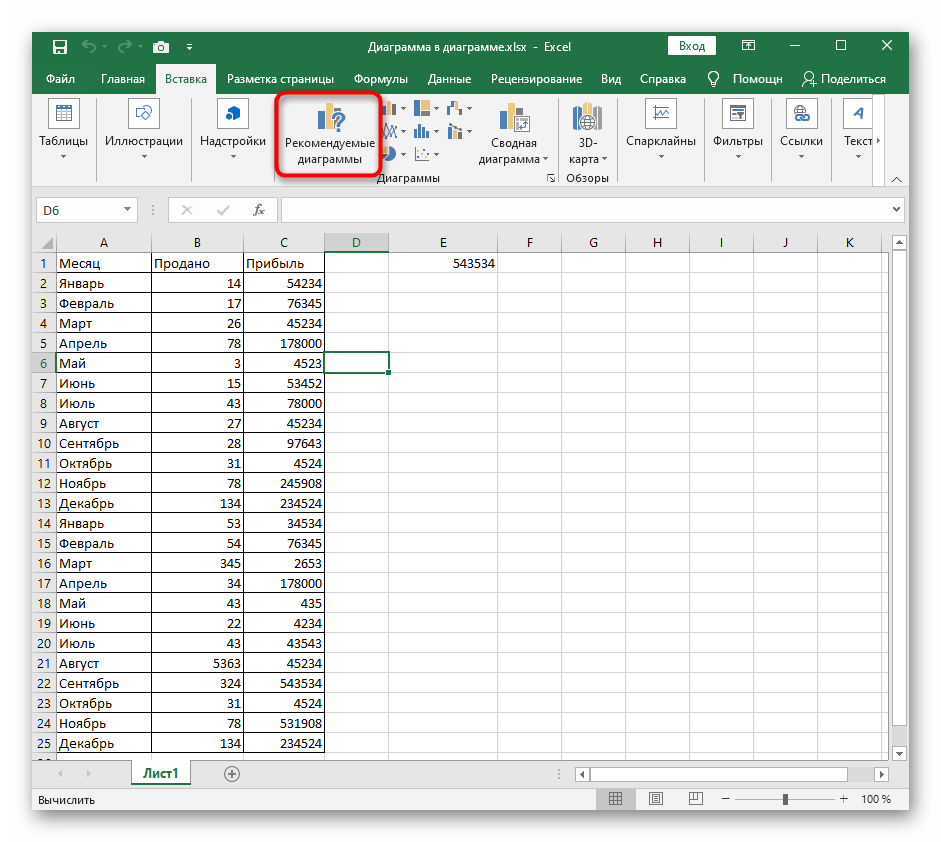 Нажмите по кнопке «Рекомендуемые диаграммы» для отображения нужного списка.