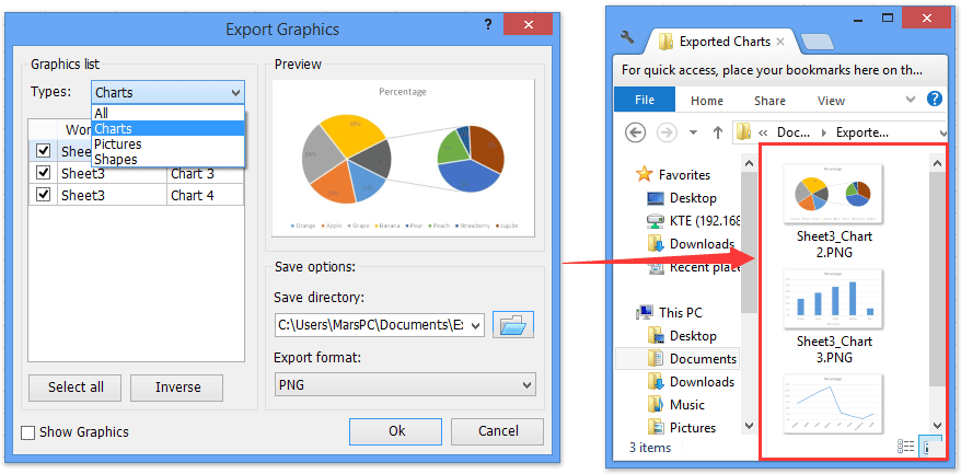 Kutools для Excel Экспорт графики Утилита может помочь пользователям Excel быстро экспортировать и сохранять всю графику (включая изображения, фигуры и диаграммы) в виде изображений. Экспортированная графика может быть сохранена во многих форматах, таких как JPEG, GIF, TIF или PNG. Полнофункциональная бесплатная 30-дневная пробная версия!
