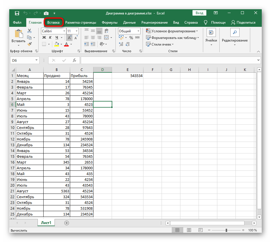 - По необходимости выделите таблицу, вокруг которой строится график, а если на листе она одна, сразу переходите на вкладку «Вставка».