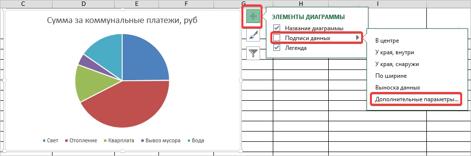 Нажимаем на Плюс, выбираем подписи данных, в которых выбираем дополнительные параметры. Выбрав категорию Значение, как на рисунке 4, на диаграмме будут показаны числовые значения: