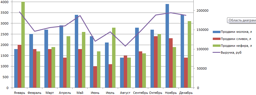 Получаем вполне наглядную диаграмму, представляющую собой объединение гистограммы и графика. Видим, что максимальная выручка была в январе и ноябре, а минимальная – в августе.