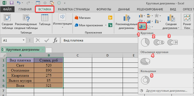 Для построения круговой диаграммы, как и любой другой, нужно выбрать диапазон, по которому диаграмма будет строится, перейти на главной ленте на вкладку Вставка – Диаграммы – Круговые диаграммы, и выбрать нужный вид. Выглядеть это будет так, как на рисунке 1: