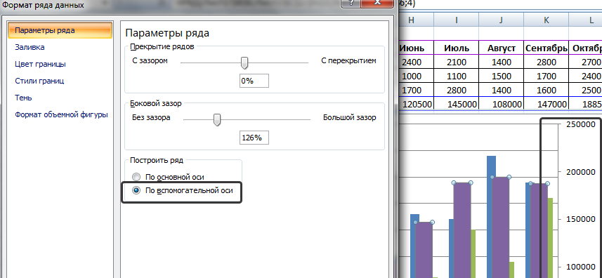 Иногда, из-за сильных различий значений рядов диаграммы, использование единой шкалы невозможно. Но можно добавить альтернативную шкалу. Перейдите в меню «Формат ряда данных…» и в разделе «Параметры ряда» переместите флажок на пункт «По вспомогательной оси».