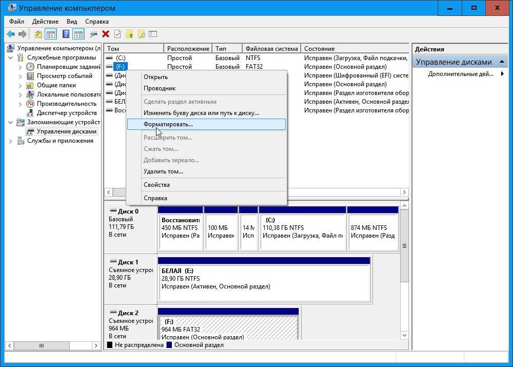 Как отформатировать флешку в FAT32 на Windows 10 через Управление дисками