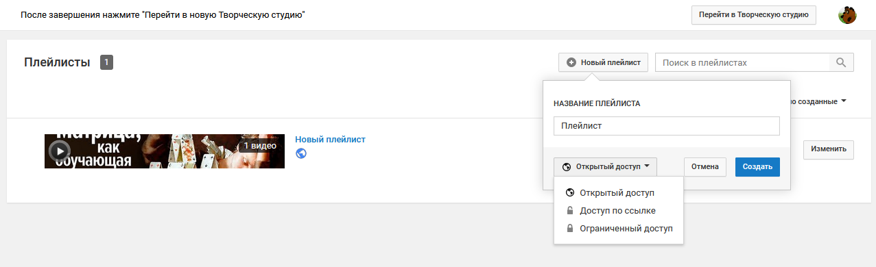 - Посетите её через контекстное меню аватарки, перейдите в раздел с плейлистами и нажмите «Новый…».