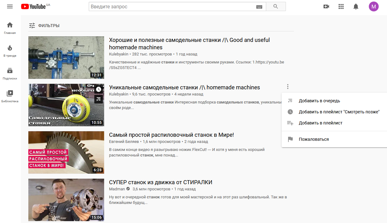- В результатах поиска, на странице подписок или находясь на чужом канале кликните по кнопке в виде трёх горизонтальных точек возле обложки видео, жмите «Добавить в плейлист».