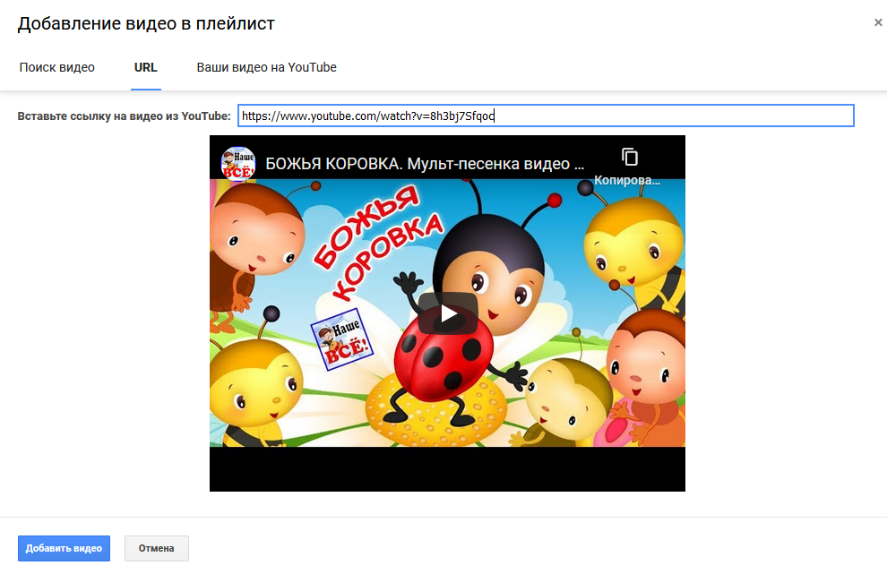 Первый способ неудобный – отсутствуют фильтры и функция сортировки контента. Прибегните ко второму – вставьте URL на файл и нажмите «Добавить».