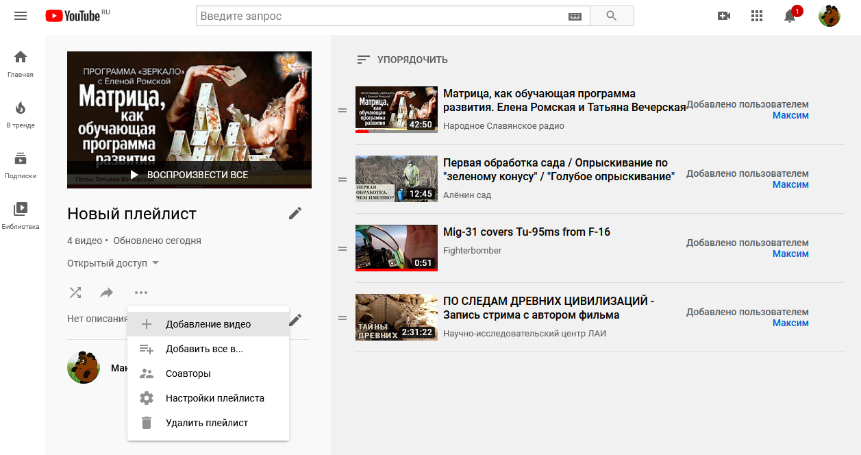 В первый и третий списки контент добавляется автоматически, второй формируется вручную. Предусмотрено пару способов, как создать плейлист на Ютубе, добавить туда видео на компьютере и смартфоне/планшете.