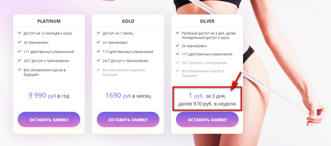 В первом тарифе есть возможность получить бесплатный доступ на 3 дня с целью ознакомления с курсами. Для этого нужно привязать пластиковую карту к платежной системе сайта и оплатить 1 рубль для проверки. Именно в этот момент подключают основную подписку на тариф SILVER стоимостью 970 руб. в неделю.