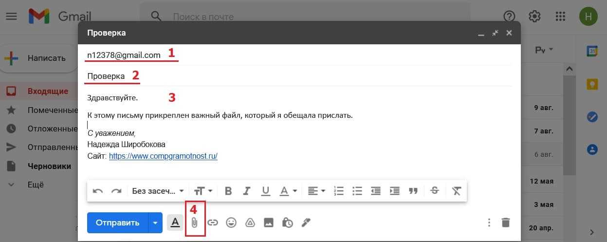Поле «Тема» на рисунке 2 выделено цифрой 2, там указано «Проверка». Иногда пользователи не указывают тему письма по разным причинам. Все-таки стоит ввести хотя бы одно слово в этом поле, либо написать длинное предложение.