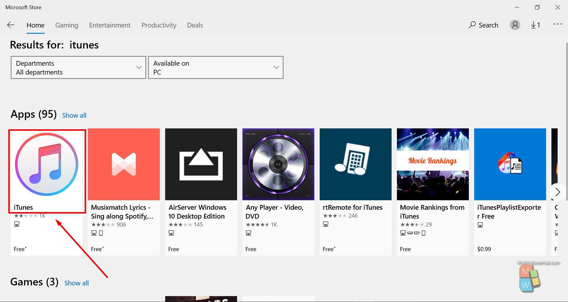 Search for the “Apple iTunes” keyword in the Windows Store.