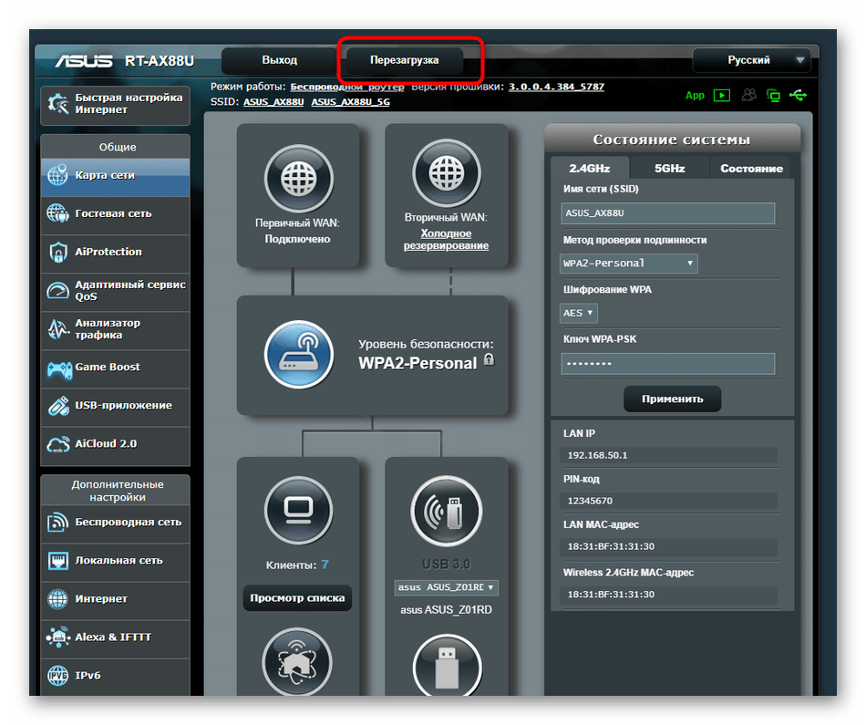 В некоторых меню настроек опция перезагрузки вынесена в первый же раздел, который чаще всего называется «Состояние» или «Карта сети». Тогда выполнять дальнейшие действия не придется. Просто кликните по этой кнопке, чтобы перезагрузить устройство.