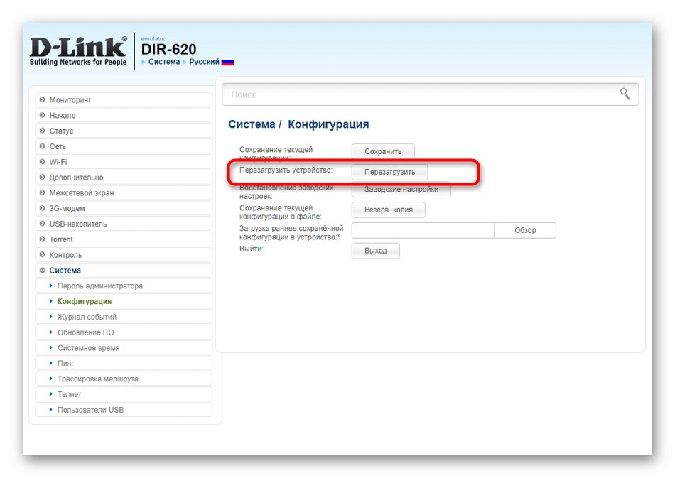 При работе с D-Link действия немного меняются. Роутеры подобного типа имеют сильно отличающийся интерфейс. Интуитивно с ним справиться можно, но это не всегда легко. Отыскать раздел, отвечающий за перезапуск модема, для неподготовленных юзеров является весьма непростой задачей.