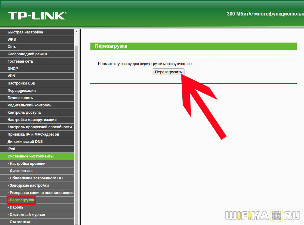 - устройства TP-Link требуют открытия меню «Системные инструменты», где находится необходимая кнопка Reboot.