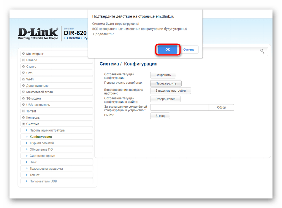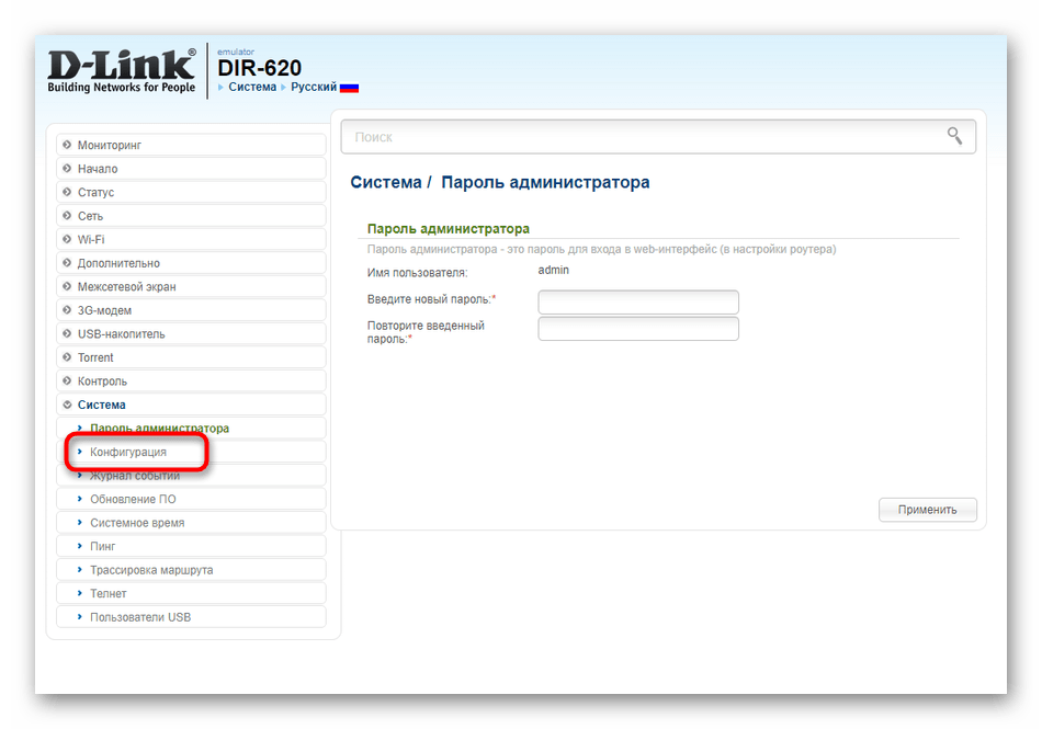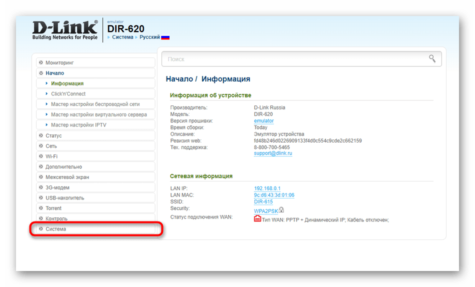 Если же такая кнопка отсутствует, придется искать ее в других разделах настроек. Разберем это на примере веб-интерфейсе D-Link, поскольку он больше всего стандартизирован и максимально похож на меню от других производителей. После авторизации через панель переместитесь в раздел «Система».