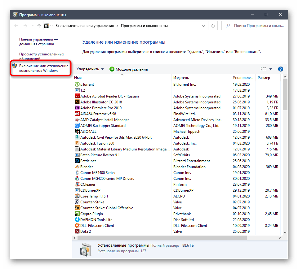 Через левую панель в появившемся окне перейдите во «Включение или отключение компонентов Windows».