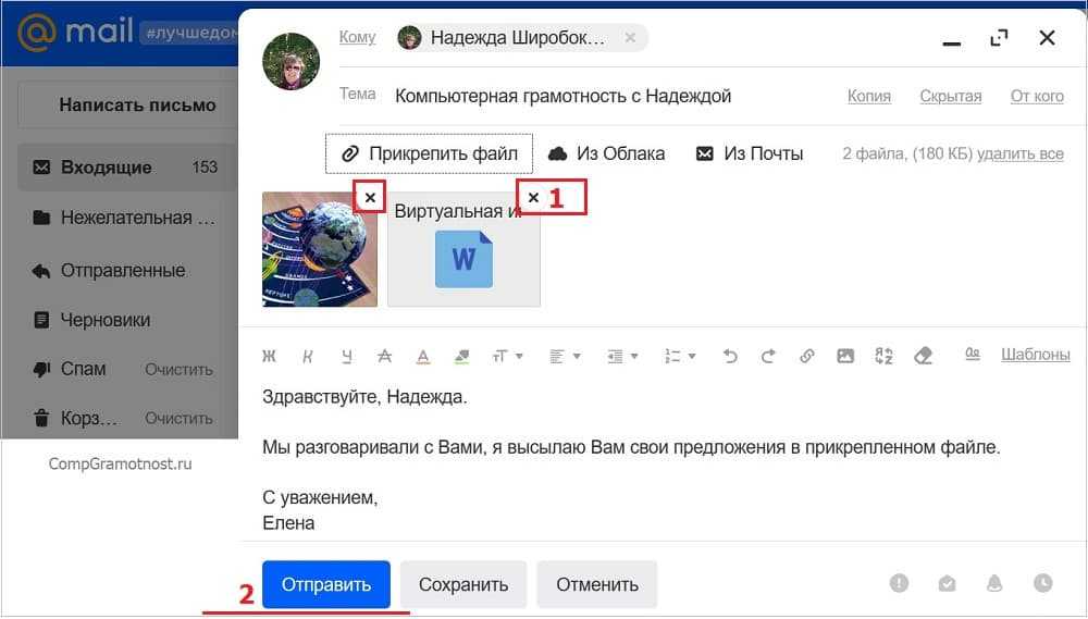 Здесь черный крестик напротив прикрепленного файла (1 на рис. 5) предназначен для открепления файла от письма, то есть, для удаления файла из письма (но НЕ из компьютера).