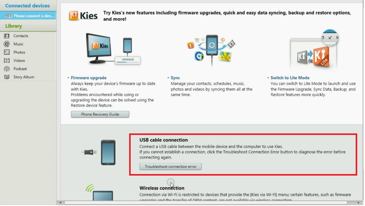 Через Samsung Kies также можно устранить ошибки соединения, выбрав соответствующий блок в главном окне.