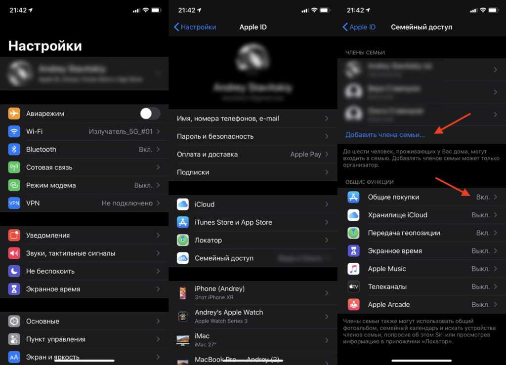 Для добавления в «семью» владельцу этой группы нужно зайти в настройки смартфона, нажать на иконку с изображением пользователя и таким образом перейти в Apple ID. Там нужно совершить два действия: во-первых, добавить необходимого пользователя (вас) в группу, во-вторых, проверить, что общие покупки включены.