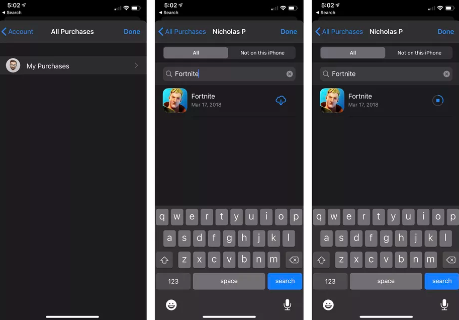 После этого вы, уже со своего смартфона, должны зайти в раздел «Мои покупки» в App Store и найти там Fortnite.