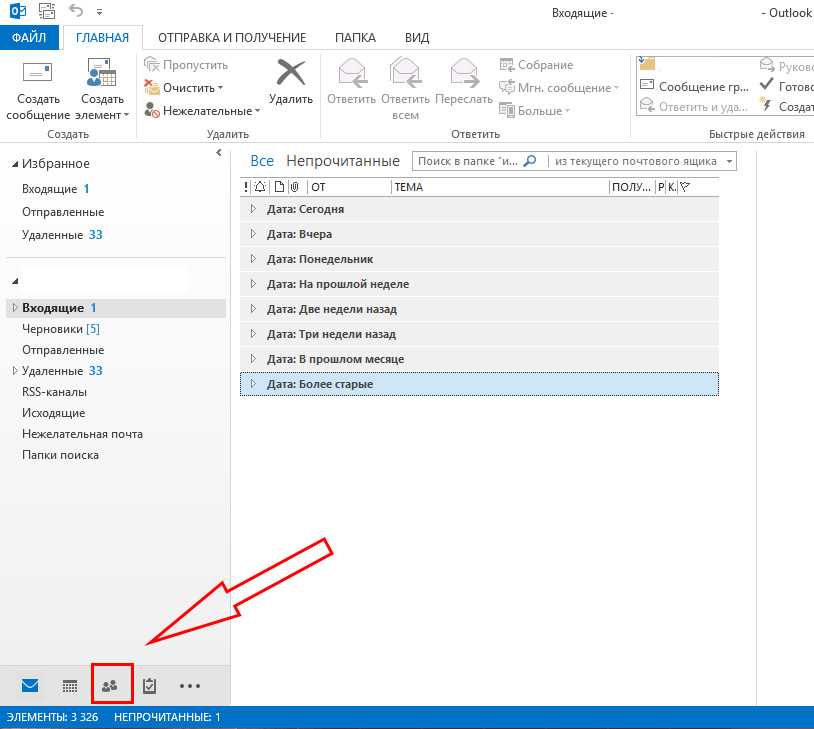- Выбрать люди в левом нижнем углу окна Outlook.