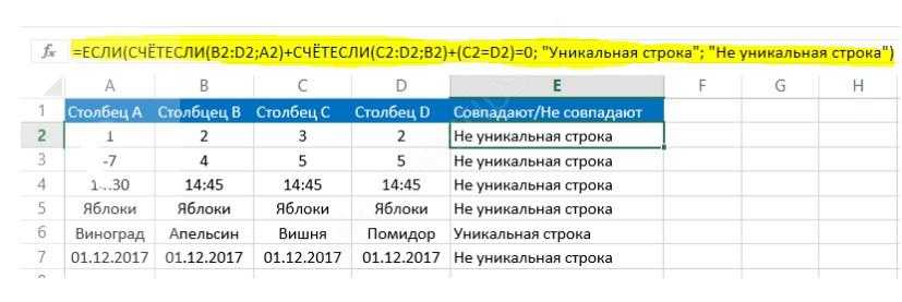 В случае, когда в таблице много больше двух столбцов, формула может быть слишком большой, ведь в ней нужно указывать параметры совпадения для каждой вертикальной секции таблицы. Чтобы оптимизировать процесс, нужно использовать другую функцию СЧЕТЕСЛИ. При этом полная запись будет иметь следующий вид: =ЕСЛИ(СЧЁТЕСЛИ(B2:D2;A2)+СЧЁТЕСЛИ(C2:D2;B2)+(C2=D2)=0; “Уникальная строка”; “Не уникальная строка”).