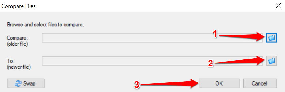 - Щелкните значок папки рядом с диалоговым окном «Сравнить (старые файлы)», чтобы добавить первый документ, который вы хотите сравнить, с инструментом. Добавьте второй файл в поле «К (новые файлы)» и нажмите «ОК», чтобы продолжить.