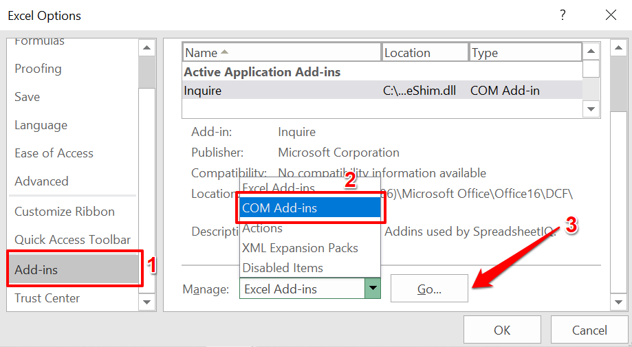 - Выберите «Надстройки» на боковой панели, выберите «Надстройка COM» в раскрывающемся меню «Управление» и выберите «Перейти».