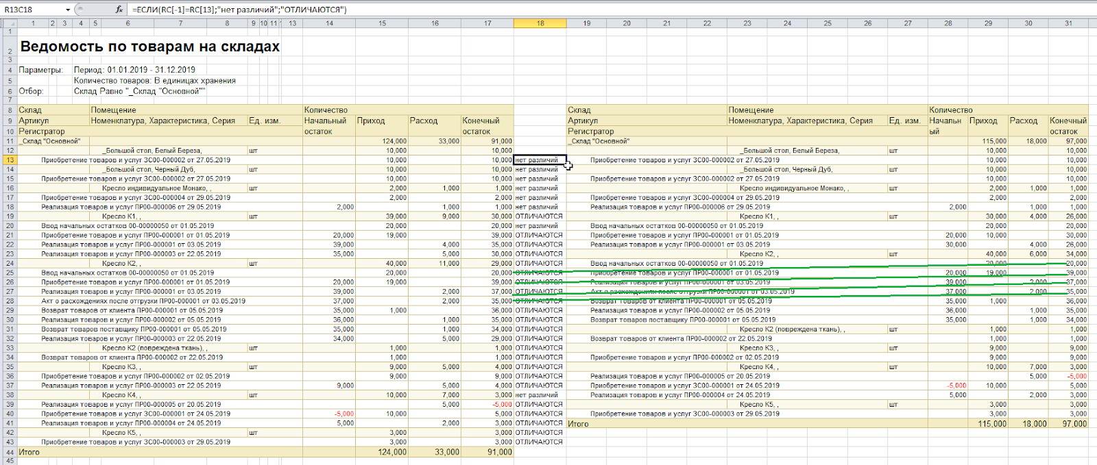 Сравнение электронных таблиц обработает файлы и выделит ячейки с разными значениями зеленым цветом.